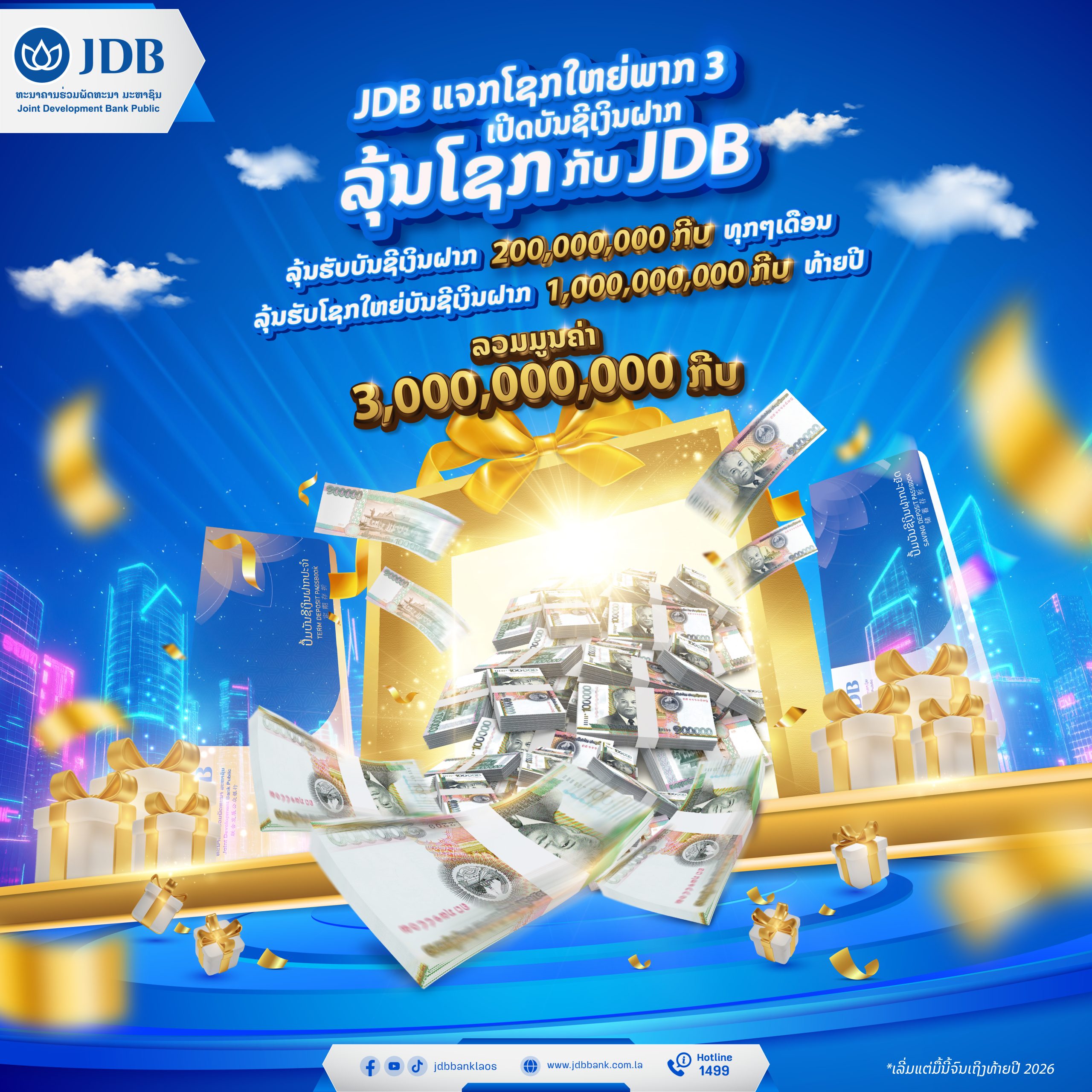 🔹 ລຸ້ນຮັບໂຊກບັນຊີເງິນຝາກ 200,000,000 ກີບ; 1 ລາງວັນ (Random ຫາຜູ້ໂຊກດີທຸກໆເດືອນ ຜ່ານເພຈ໌: JDBBank).